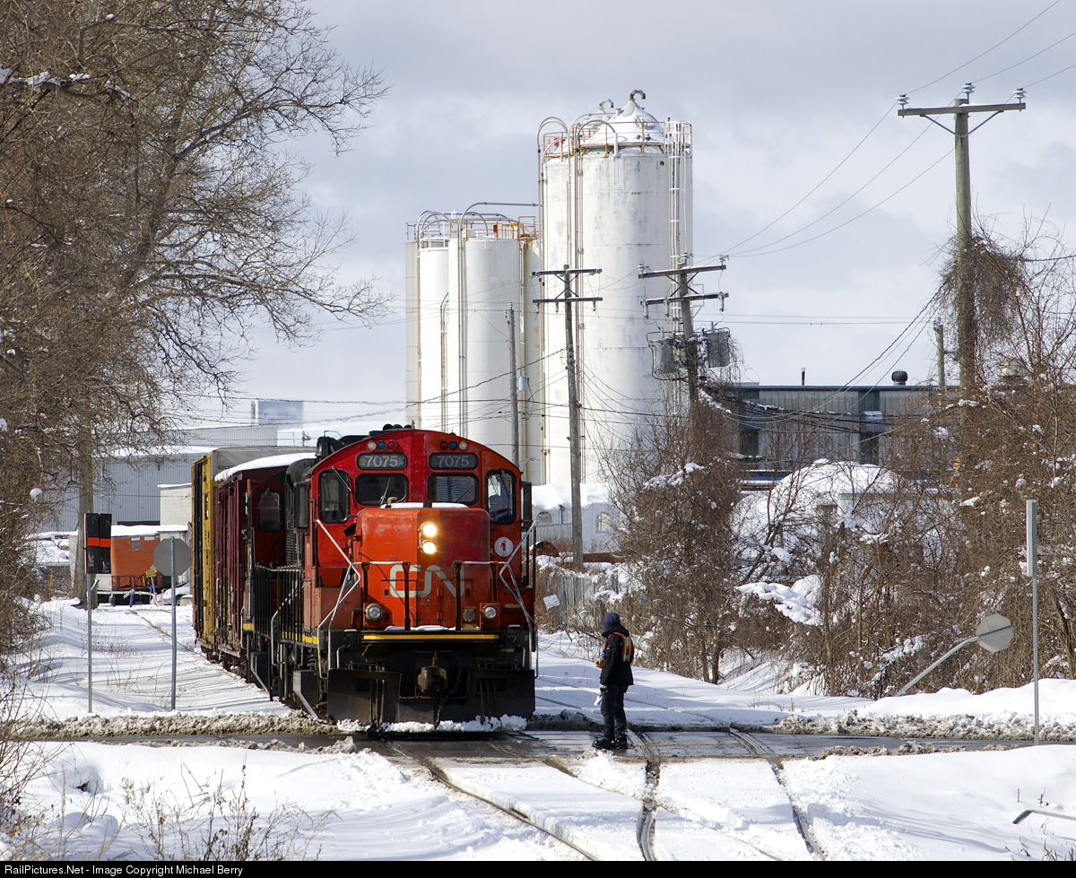| Done flagging. After flagging Monk Boulevard, a crewmember is about to climb back onto CN 7075 as the Pointe St-Charles Switcher leaves the Turcot Holding Spur with two boxcars in tow. |