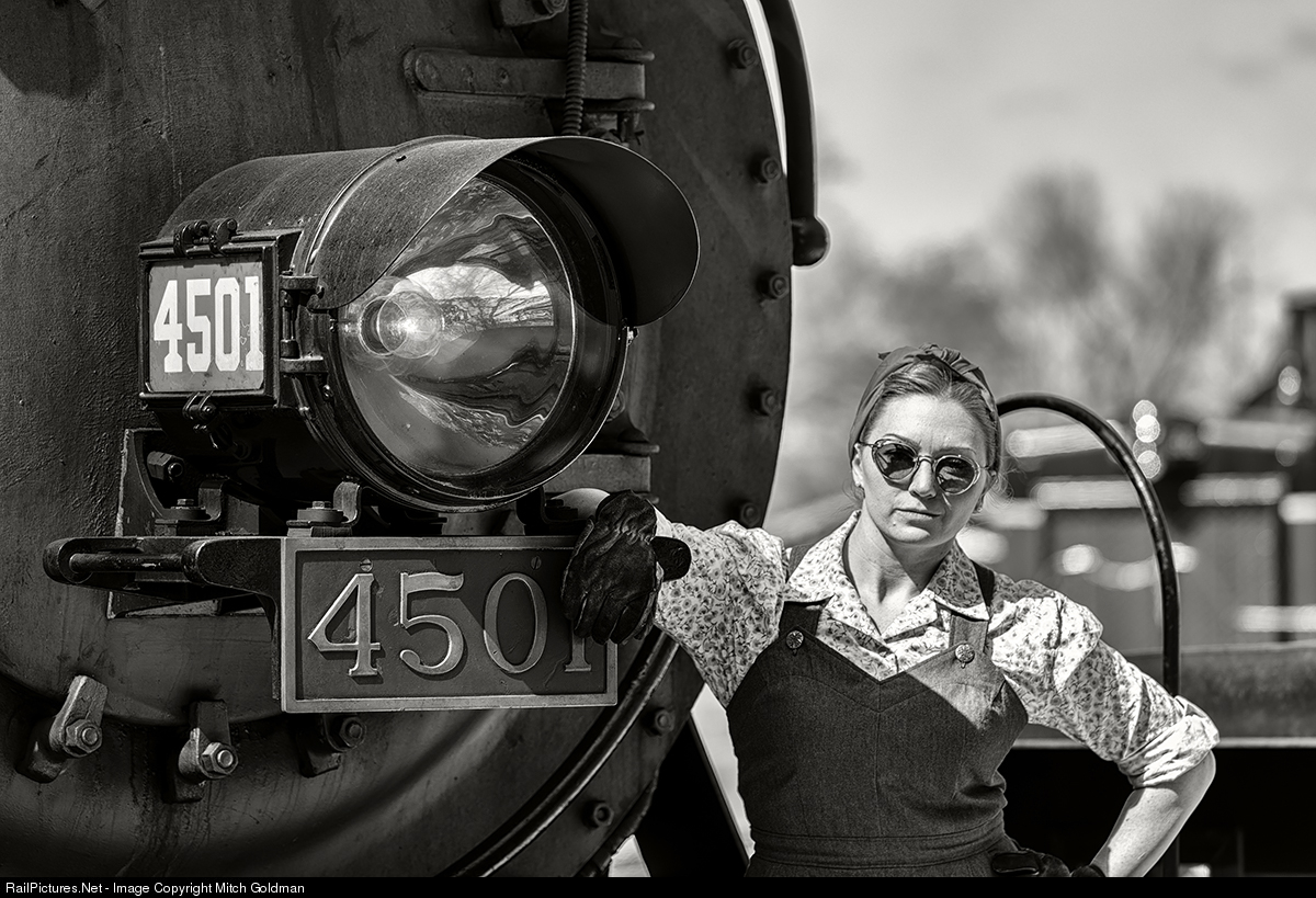 A Southern Railway employee poses for a photo by one of the railroad's steam locomotive.