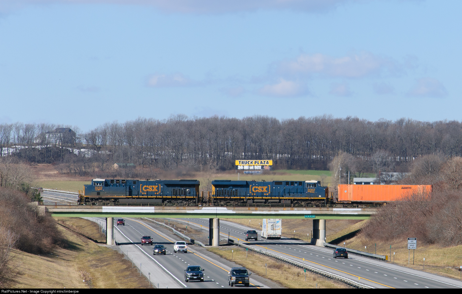 On a sunny February day, a matched pair of CSX ES44AC's lead intermodal train Q017 west and cross over the New York State Thruway.