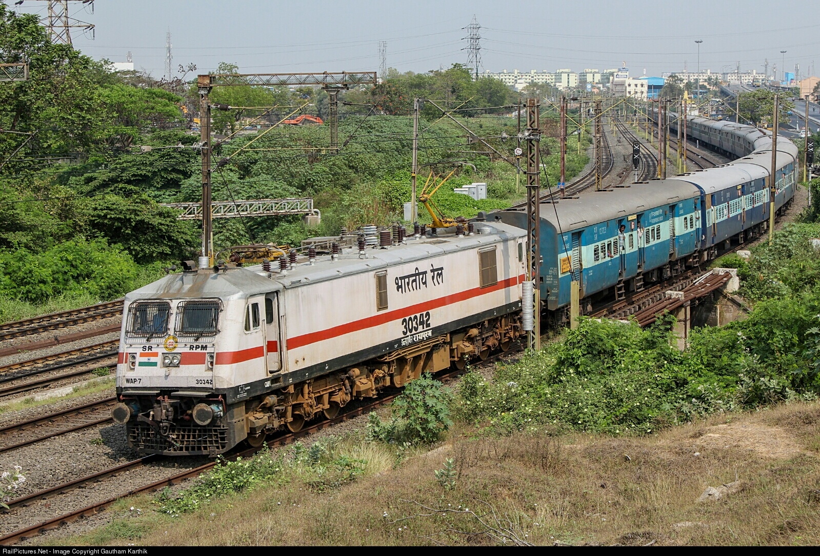 | On one fine sunday morning, Royapuram WAP-7 powering Thiruvananthapuram-Chennai express slowly curves into Basin Bridge nearing its destination. |