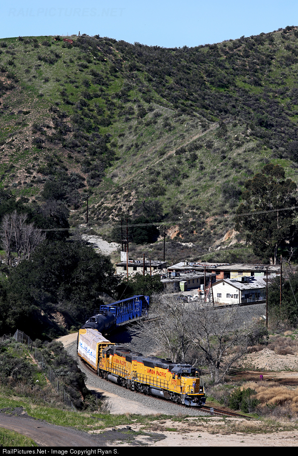| En route to another of their customers in Via Princessa Union Pacific's westbound 'Saugus' local rolls through Bermite Canyon in Santa Clarita, CA. This location between Saugus and Honby on the former Southern Pacific Saugus Line was once a munitions testing and manufacturing site, now under clean up due to contamination issues. On the point is Union Pacific 1375 (ex-SP 3199) one of three former SP GP40P-2s purchased for commute operations on the San Francisco Peninsula in the 1970s. The very unique EMD's days of heading up commuter trains has since passed however it does find itself dodging Metrolink commute schedules as the Saugus goes about their work. |