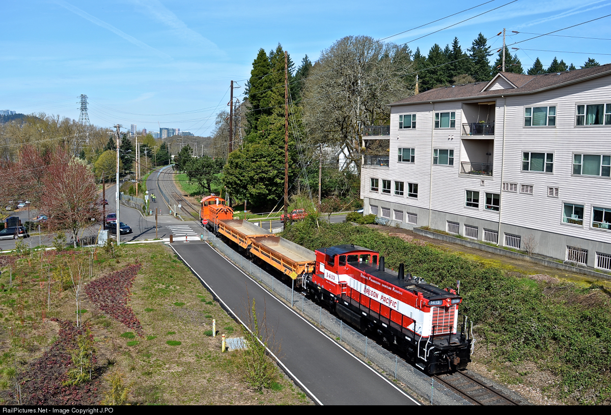 | Assisting a culvert rebuild project being financed by the City of Portland, OPR 1413 & OPR 100 hustle two empty dump cars back to reload in Milwaukee. |