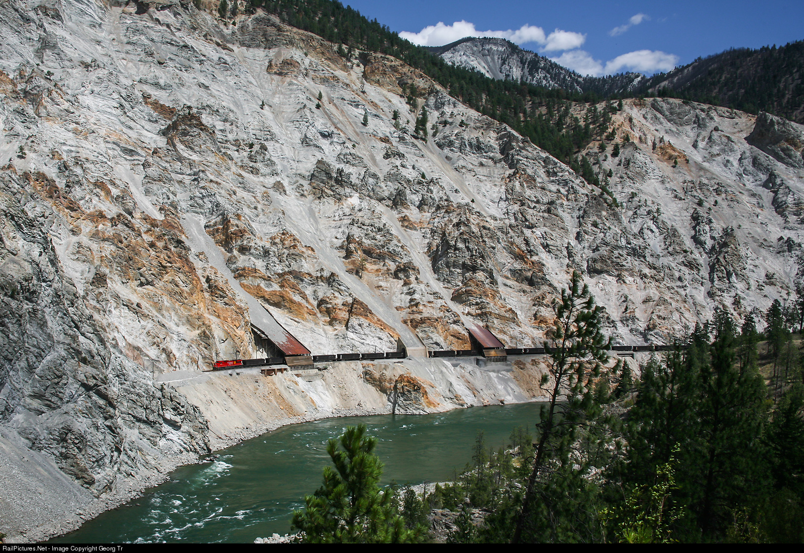 | A long loaded coal train of the Canadian Pacific Railway is rolling downstream along the Thompson river east of Lytton towards the port of Vancouver. Top and tail is a AC4400CW, running radio controlled. |