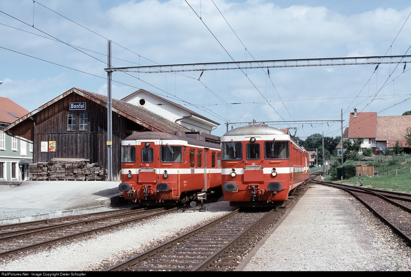 | An unusual level of traffic with BDe 4/4 101 in normal operation and Bt 121 + De 4/4 111 as a photographer's special side by side. |