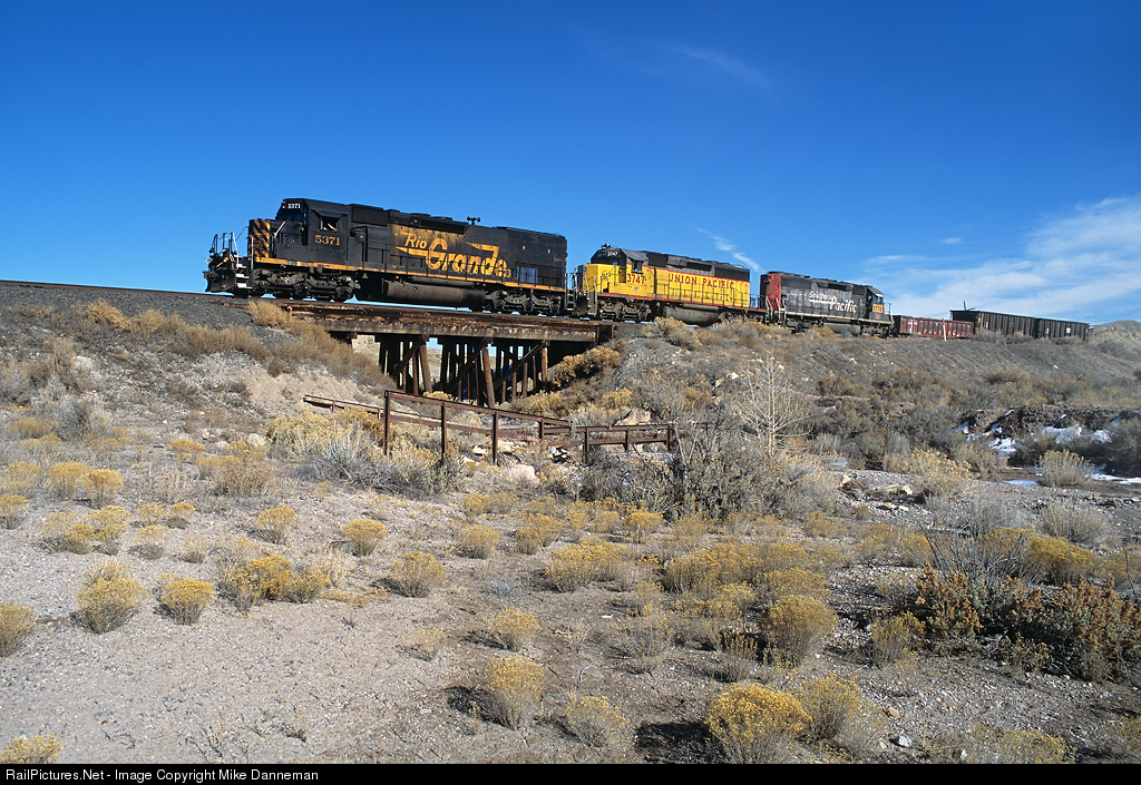 On February 9, 2006, Rio Grande EMD SD40T-2 Tunnel Motor No. 5371 leads Union Pacific SD40-2 No. 3747 and a patched former Southern Pacific SD40-2M No. 2776 on a very short three-car LJP45 dirt train local heading back to Helper yard crossing Bridge 607.46 east of Wash, Utah. On January 31, 2006, No. 5371 became the last Rio Grande locomotive on the UP system still in original paint and numbers.