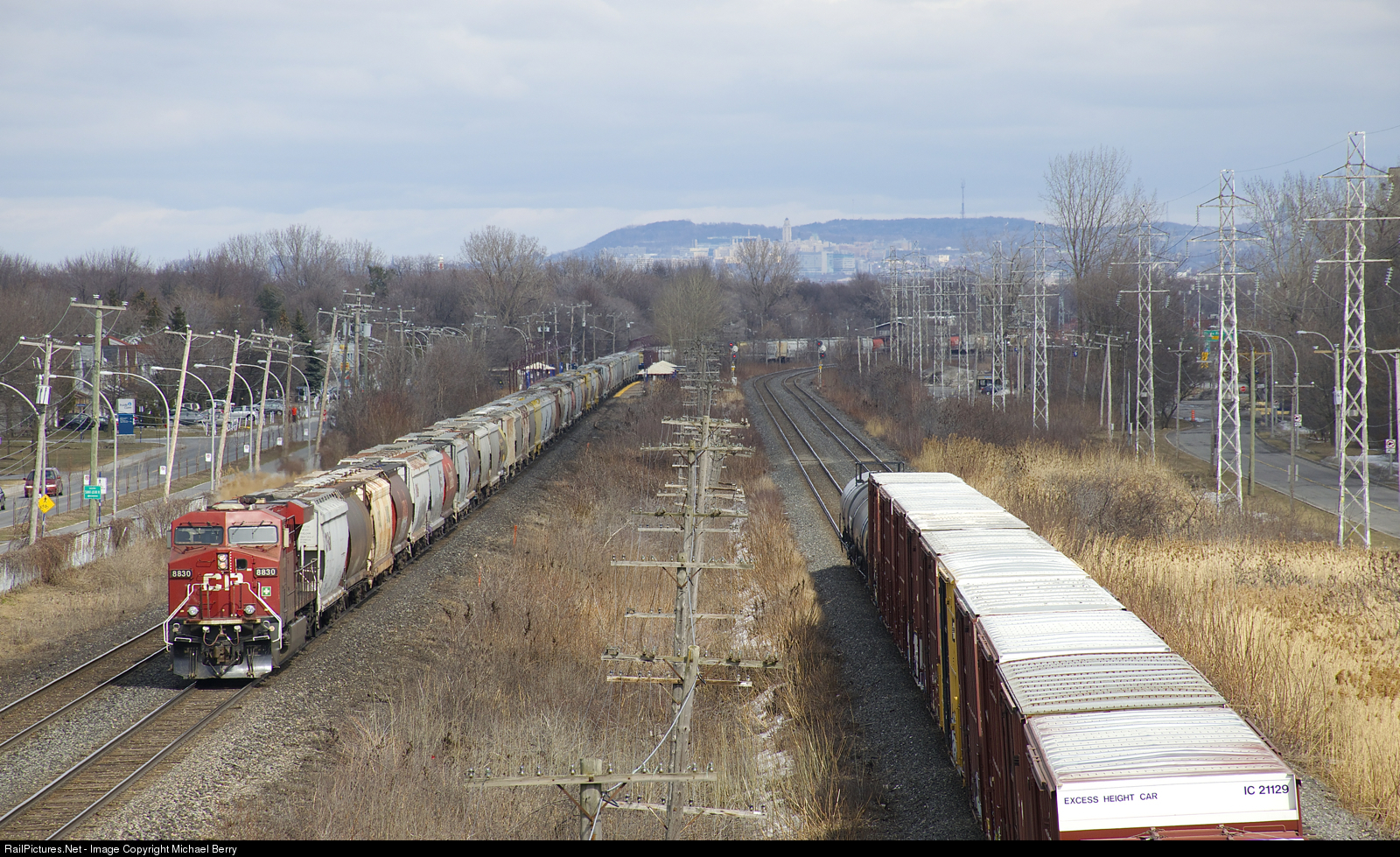 | Tail ends passing. Grain train CP 332 is eastbound through Pointe-Claire, with CP 8830 bringing up the rear, passing just as the tail end of CN 327 passes on the parallel CN Kingston Sub. |