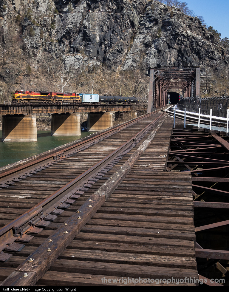 | CSX K673 is on the bridge built in the 1930s which required the widening of the tunnel. The bridge in the foreground was built in the 1890s and was the second alignment that replaced the original that went around the mountain (Sandy Hook Road sits on the opposite river bank) with the railroad piercing Maryland Heights with the tunnel in the distance. The wide width of the bridge is due to the road that crossed alongside the railroad before it was rerouted to the current Route 340 alignment. |