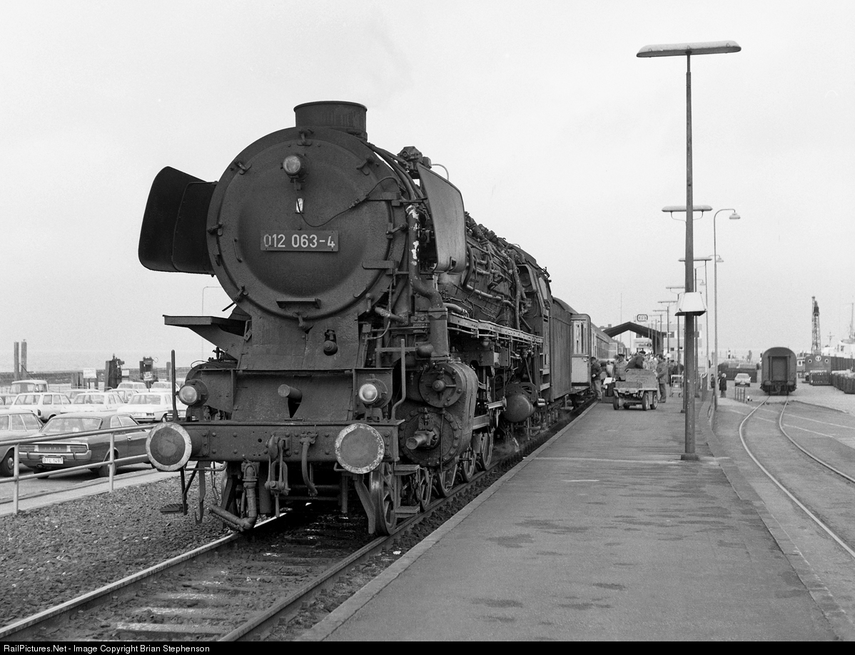 DB class 012 oil-fired Pacific No 012 063-4 waits to leave Nordeich-Mole with the 11.07 D-Zug (express train) to Köln. Originally streamlined, this three-cylinder engine was No 01 1063 until 1968 when the coal fired engines became 011 and oil-fired 012 in computer numbering scheme. It was built by Berliner Maschinenbau AG and entered service in February 1940. The streamlining was removed in 1949, equipped to burn oil in 1958 and finally taken out of service in June 1975. But that was not the end and since 1977 has been displayed in the city of Braunschweig.