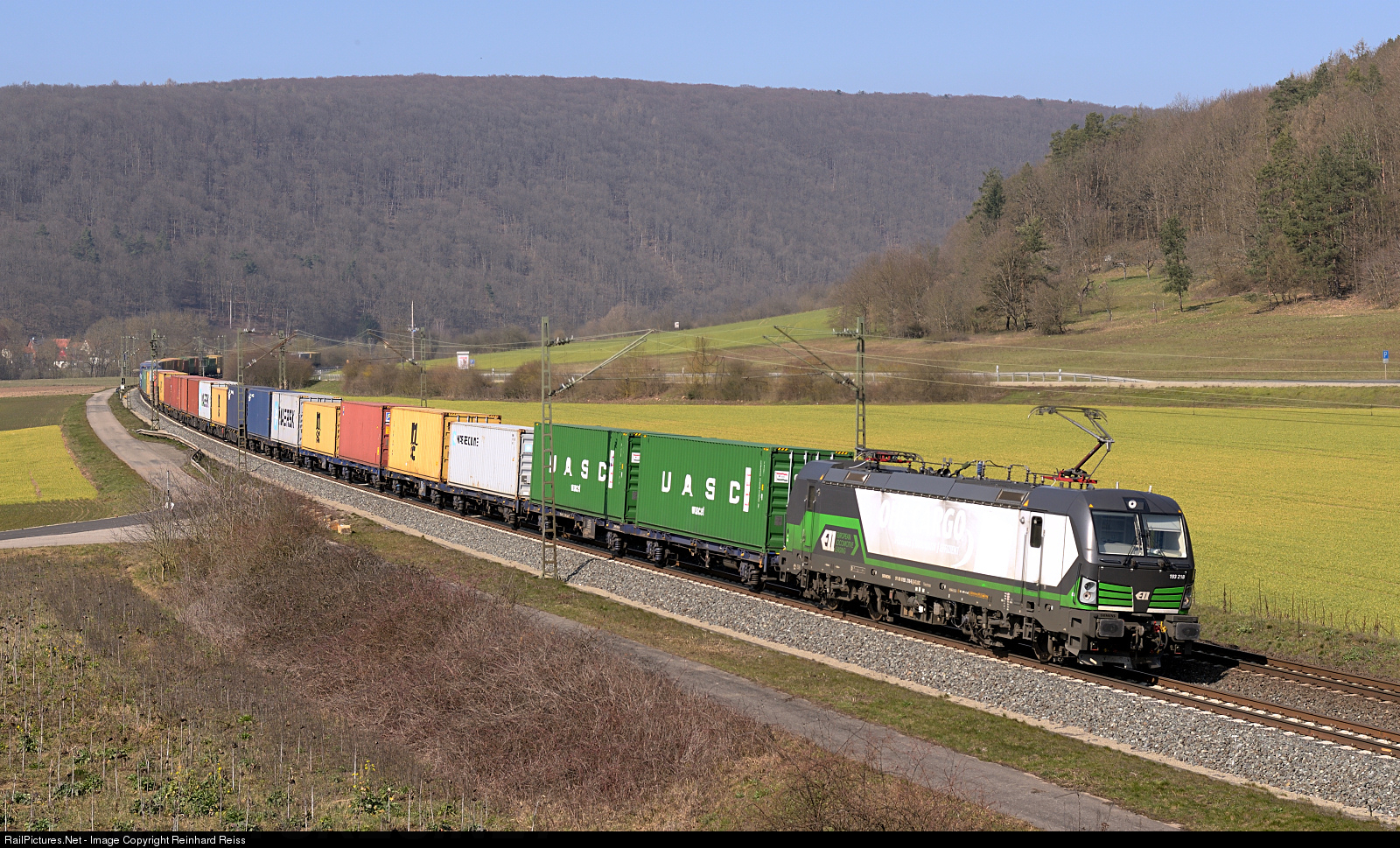 ELL Vectron 193 218 hired by SETG heads a southbound container train near Wernfeld.