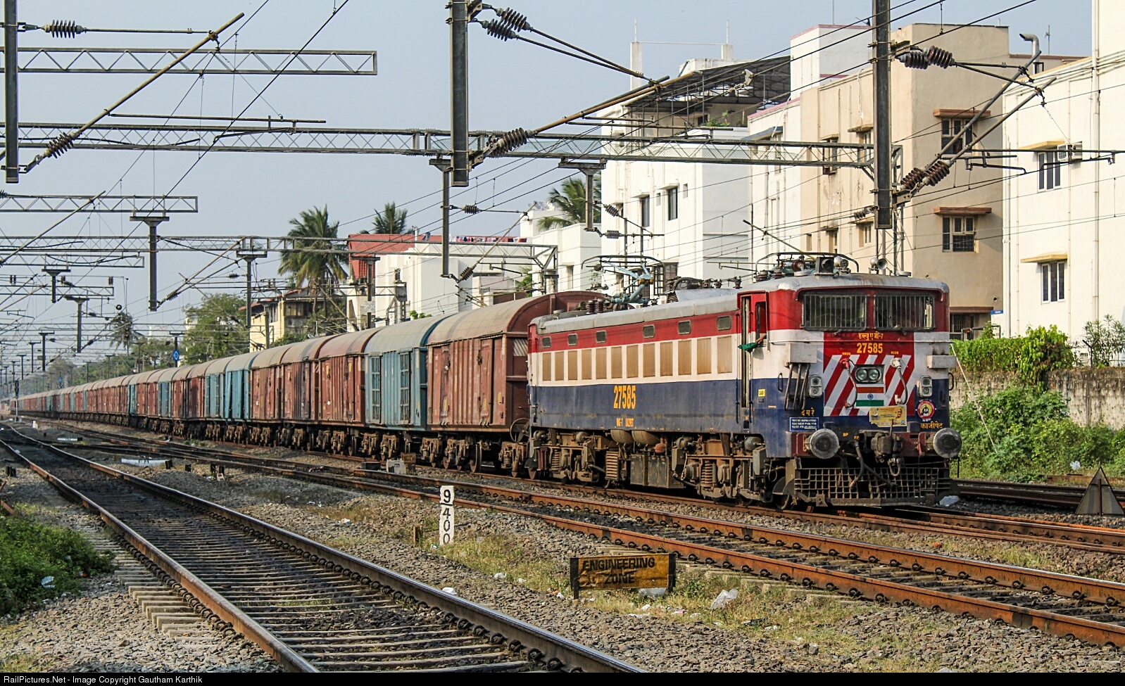 | Kazipet WAG-7 in "tigerface" livery about to switch tracks at Kodambakkam powering BCNHL freight bound South. |
