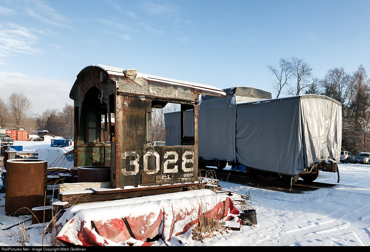 The cab of former NdeM 4-8-4 No. 3028 (owned by the ALCO Historical and Technical Society) sits in the back yard of the New Hope & Ivyland Railroad pending disposition. The "light" 4-8-4 locomotive was leased and shipped to New Hope in 1997 for a hoped for restoration to operation. Though the disassembly was completed, and work was started, it became a "rainy day" project with work eventually coming to a complete halt. The locomotive itself sits further back in the yard, on the deadline, with its tender. To the right, and in back of the cab, under the tarp is the railroad's former Northampton & Bath, ex-Lehigh and New England caboose which is being restored.