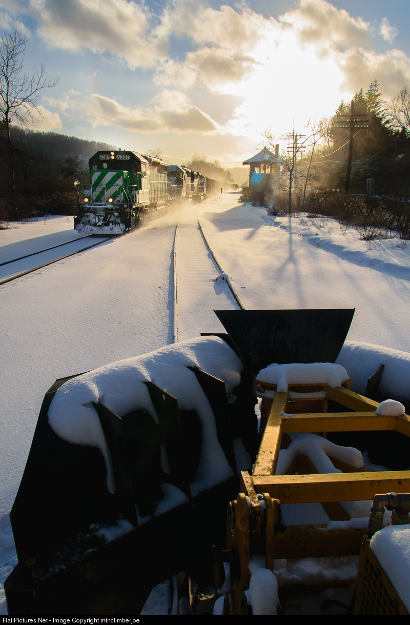 The snowplow waits on the old main to Buffalo as a Wheeling & Lake Erie SD40-2 leads a B&P coke train through Ashford Junction, kicking up a cloud of fresh snow as it heads toward Machias. Note: Photo taken from ladder next to tracks/equipment.