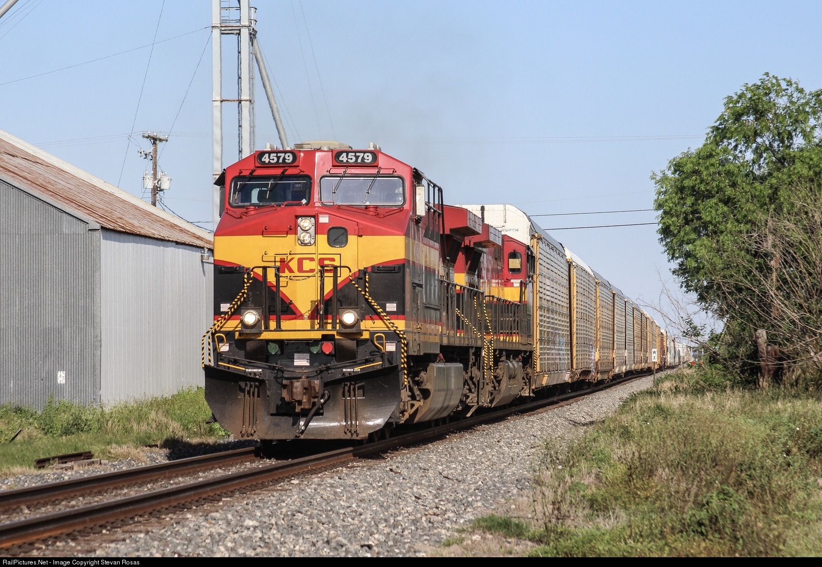 KCS 4579 along with another repainted KCSM belle unit, thunder south at track speed through the quiet town of Banquete, TX with a lengthy manifest in tow. I grew up with the "Grey Ghost" scheme on these units, and as sad as it is to see them slowly fade away, that belle paint looks pretty sharp in the afternoon sunlight.