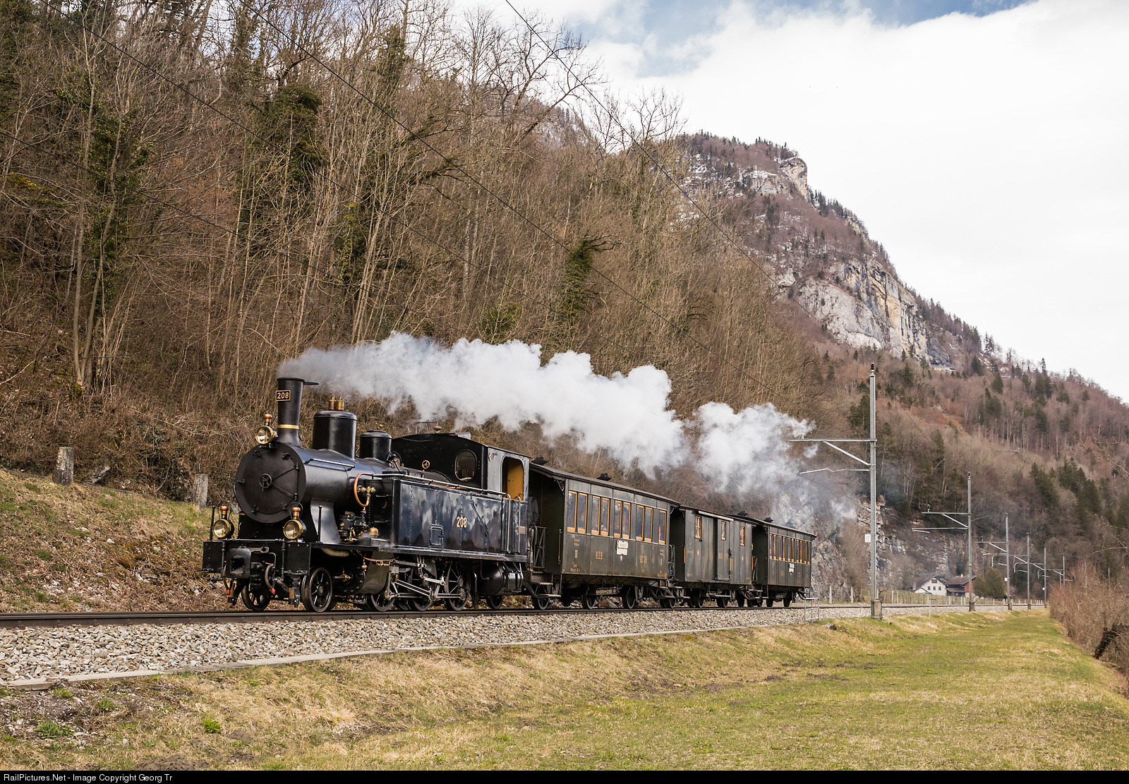 The 2-6-0 meter gauge G 3/4 # 208 (SLM 1913) of the association Ballenberg Dampfbahn (BDB), which is running on the tracks of the Zentralbahn, suffered serious damage in the fire at the Interlaken Ost shed on 16th November 2013. Now she is like new, rebuilt by the workshop of the Rhaetian Railway in Landquart. She is pulling the first official train from Innertkirchen via Meiringen to Interlaken Ost after the refurbishment, near Brienzwiler.
