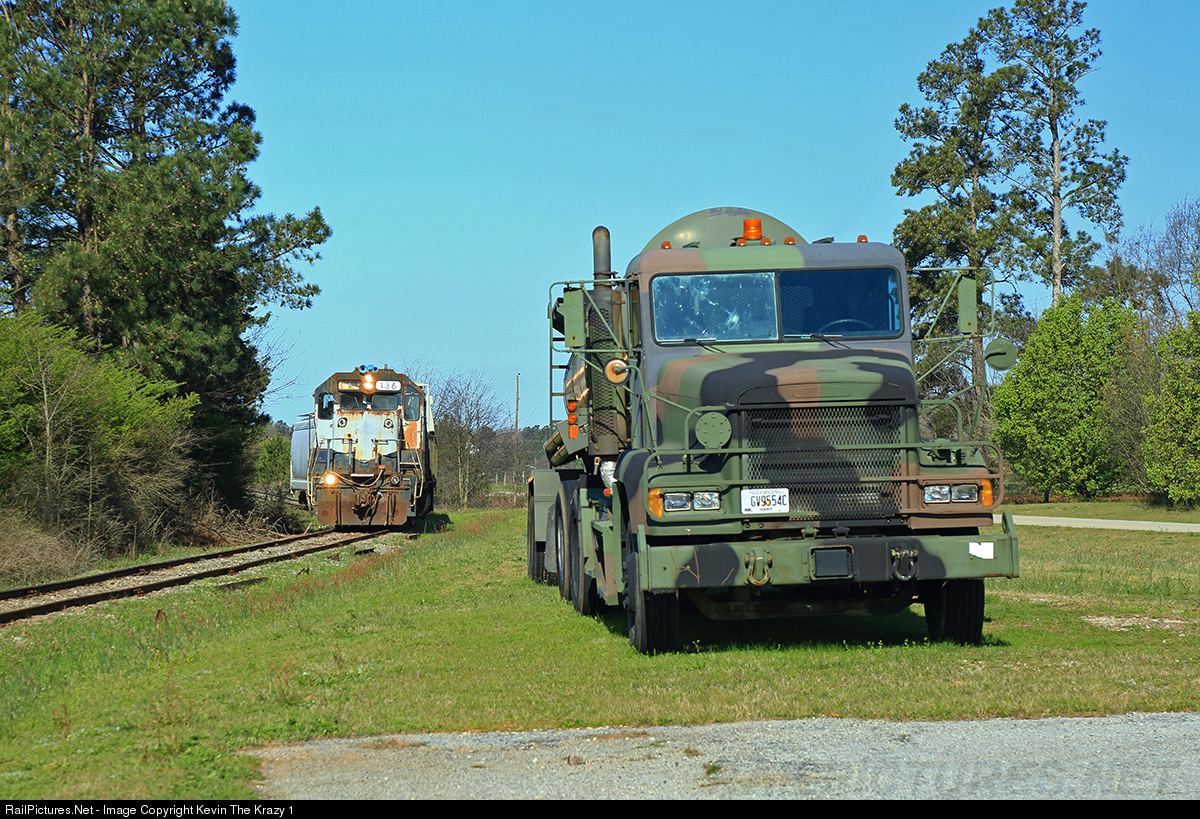 Eastbound Hartwell train over the original line to Airline Jct and downtown Hartwell passes a military truck stationed by the Hart County Fire Department just outside Bowersville. Storage cars are often stored on this line, but once or twice per month they need to be cleared to service Quality Holdings on the west side of Hartwell.