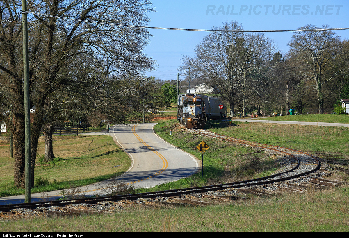 | Eastbound Hartwell train over the original line to Airline Jct and downtown Hartwell creeps through the S curves along Airline-Goldmine Road shortly before arriving at Airline. Upon arrival at Airline the crew will tie the train down and continue their days work elsewhere. |
