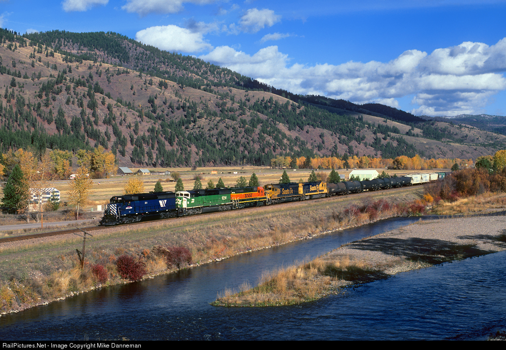 A colorful locomotive consist leads Burlington Northern Santa Fe HKCKPAS westbound through Rock Creek between Bonita and Clinton, Montana, over MRL’s Third Subdivision on October 15, 2000. MRL No. 301, a former Clinchfield/CSX SD45-2 leads the train. Trailing are BN SD60M No. 9214, BNSF GP39M No. 2876, former Santa Fe SD45-2 No. 6471 and GE B40-8 No. 8616. The empty grade between the train and the Clark Fork is Milwaukee Road’s Pacific Extension right-of-way. For 35 years until 2018, Rock Creek was popular in some circles for its annual ‘Testicle Festival’ known as ‘Testy Fest’ each summer at the Rock Creek Lodge that features a wild celebration surrounding music, beer and consumption of ‘Rocky Mountain Oysters.’ Their advertising stated, “You’ll have a ball! If you miss it, you’re nuts!”