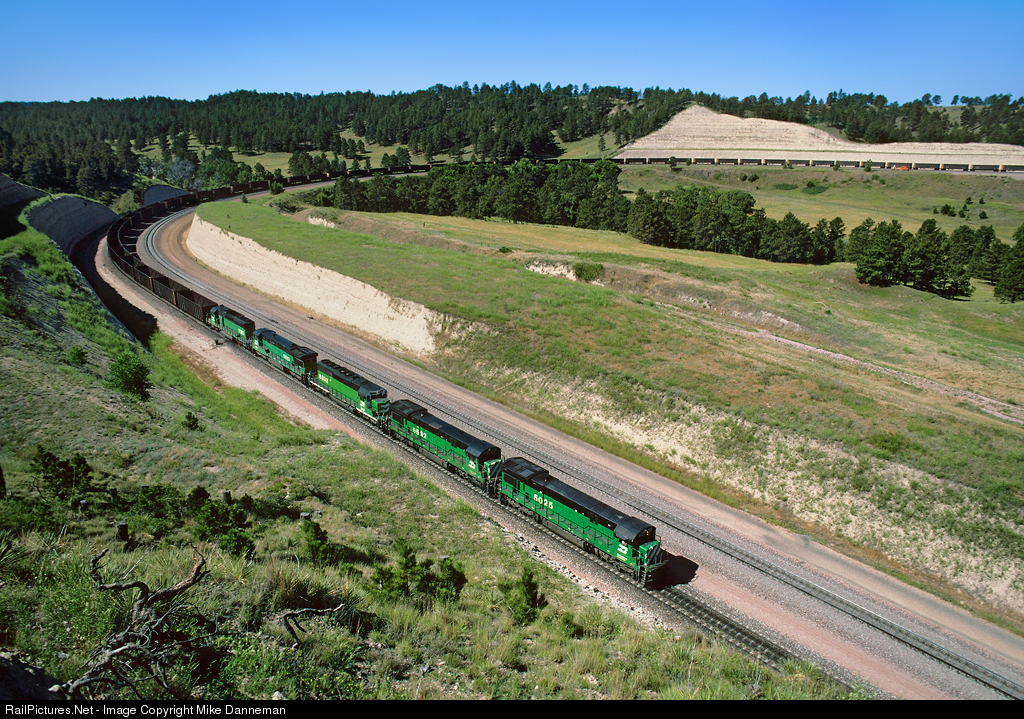 Dropping downgrade through the horseshoe curve below Belmont on Nebraska’s Crawford Hill is an empty Burlington Northern coal train headed for reloading in Powder River Basin. Three GE C30-7s and two EMD SD40-2s power the westbound train on a sunny July 9, 1994.