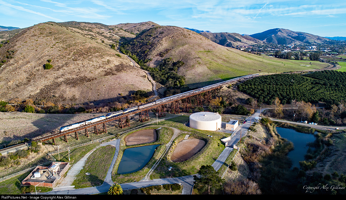 Beginning the climb up Cuesta Pass, Amtrak's northbound Coast Starlight, carrying a pair of Amtrak California units, crosses Stenner Creek trestle as it approaches the Gold Tree horseshoe curve. The two California Department of Transportation (CDTX) units, CDTX 2051 and 2052, are returning home to Oakland after assisting for nearly two weeks on Pacific Surfliner trains between Los Angeles and San Luis Obispo that operated as the only means of transportation for a time following the deadly Montecito mudslides.