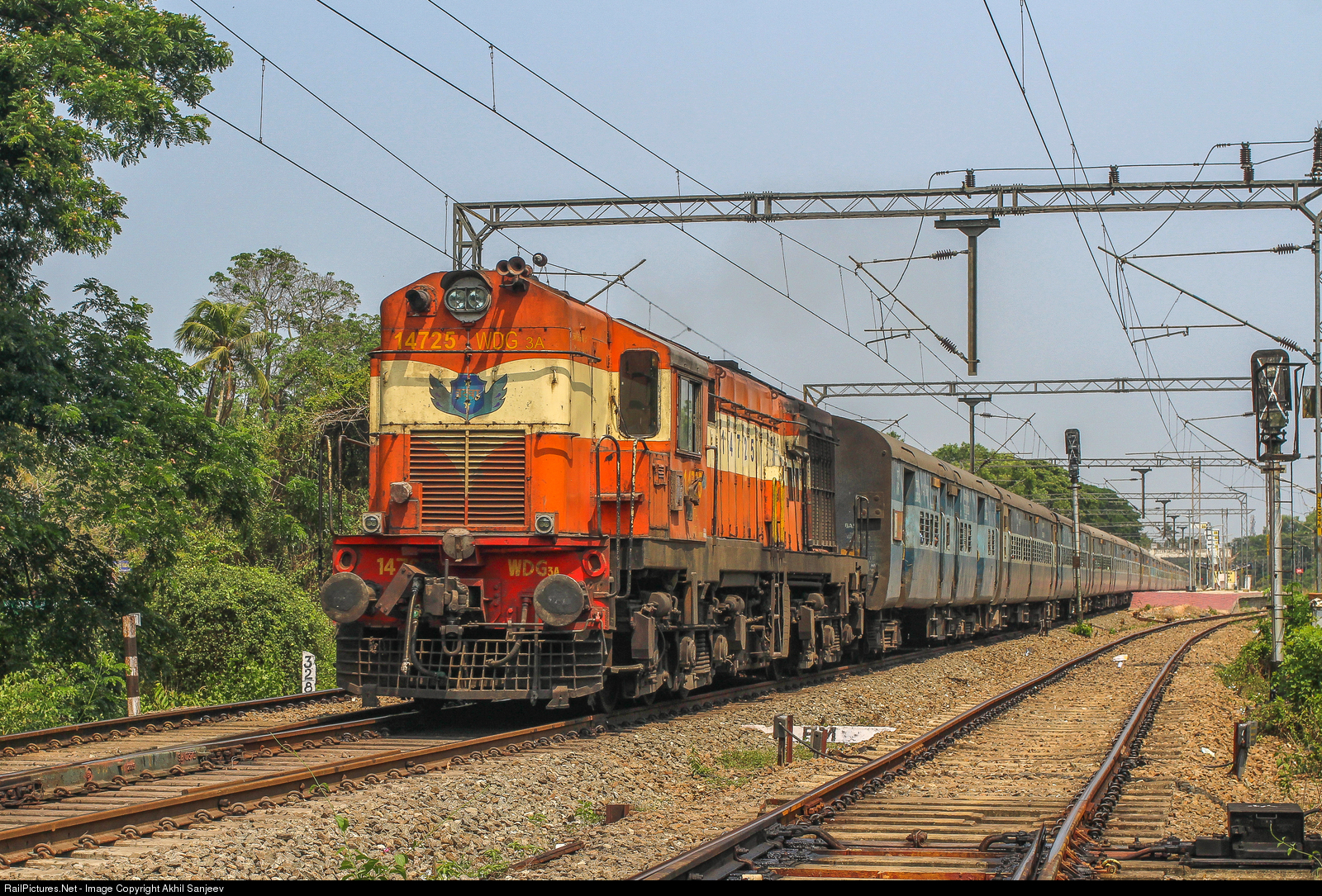VATVA WDG 3A 14725 leads Tirunelveli-Jamnagar express as it skips Cherthala at maximum permissible speed |