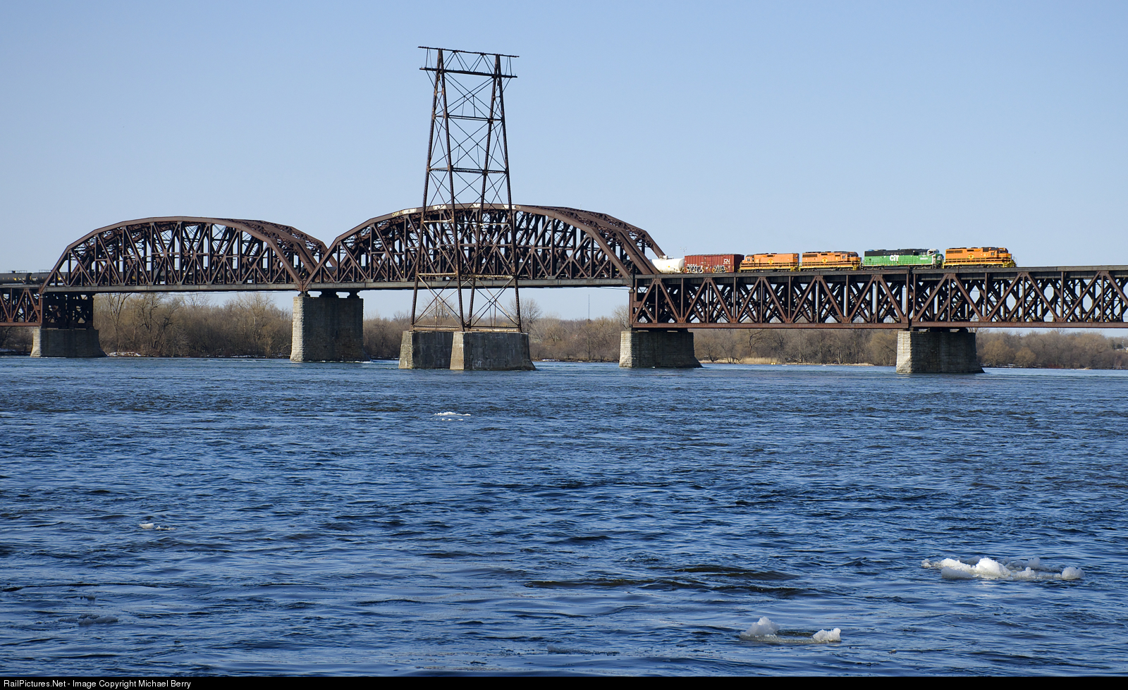 The last inbound detour? Reports indicate that the washed out SLR bridge at Bromptonville, Qc may reopen within a couple of days, meaning this SLR 393 may be the last detour to enter Montreal. Power is QGRY 3105, CBFX 6028, SLR 3803 & SLR 803 as the train crosses CP's bridge across the St. Lawrence River.