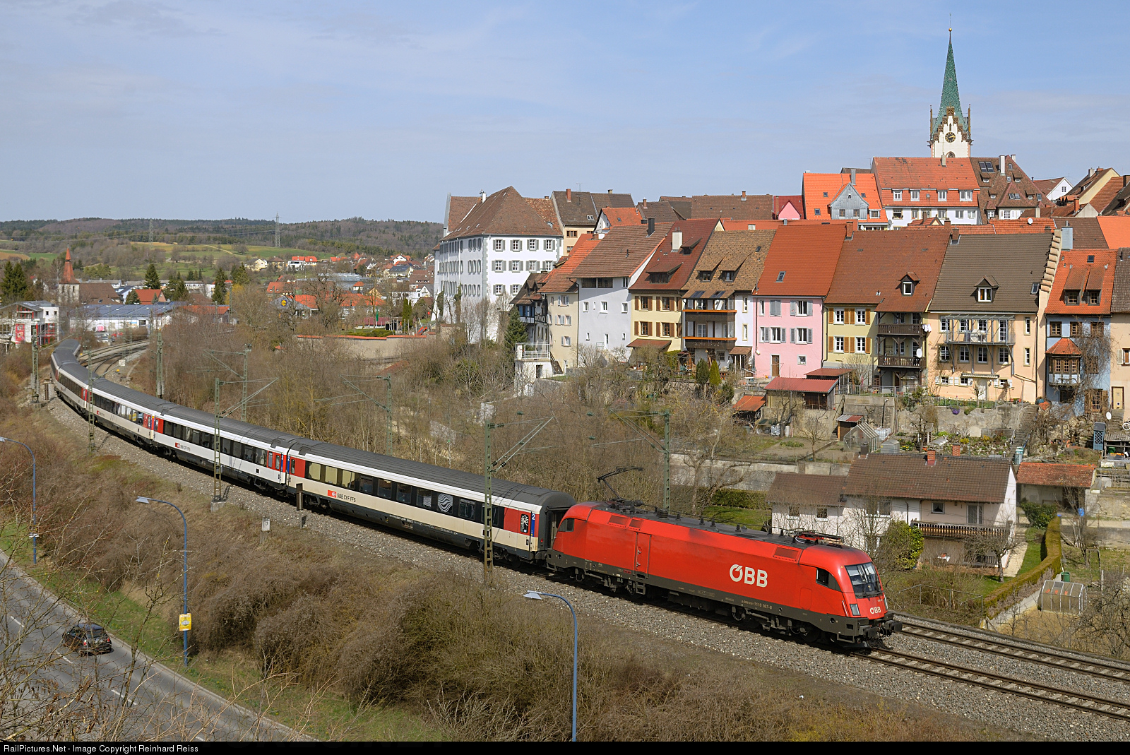 ÖBB 1116 167 (rented to DB AG) passes the picturesque old town of Engen with IC 187 from Stuttgart to Zurich.