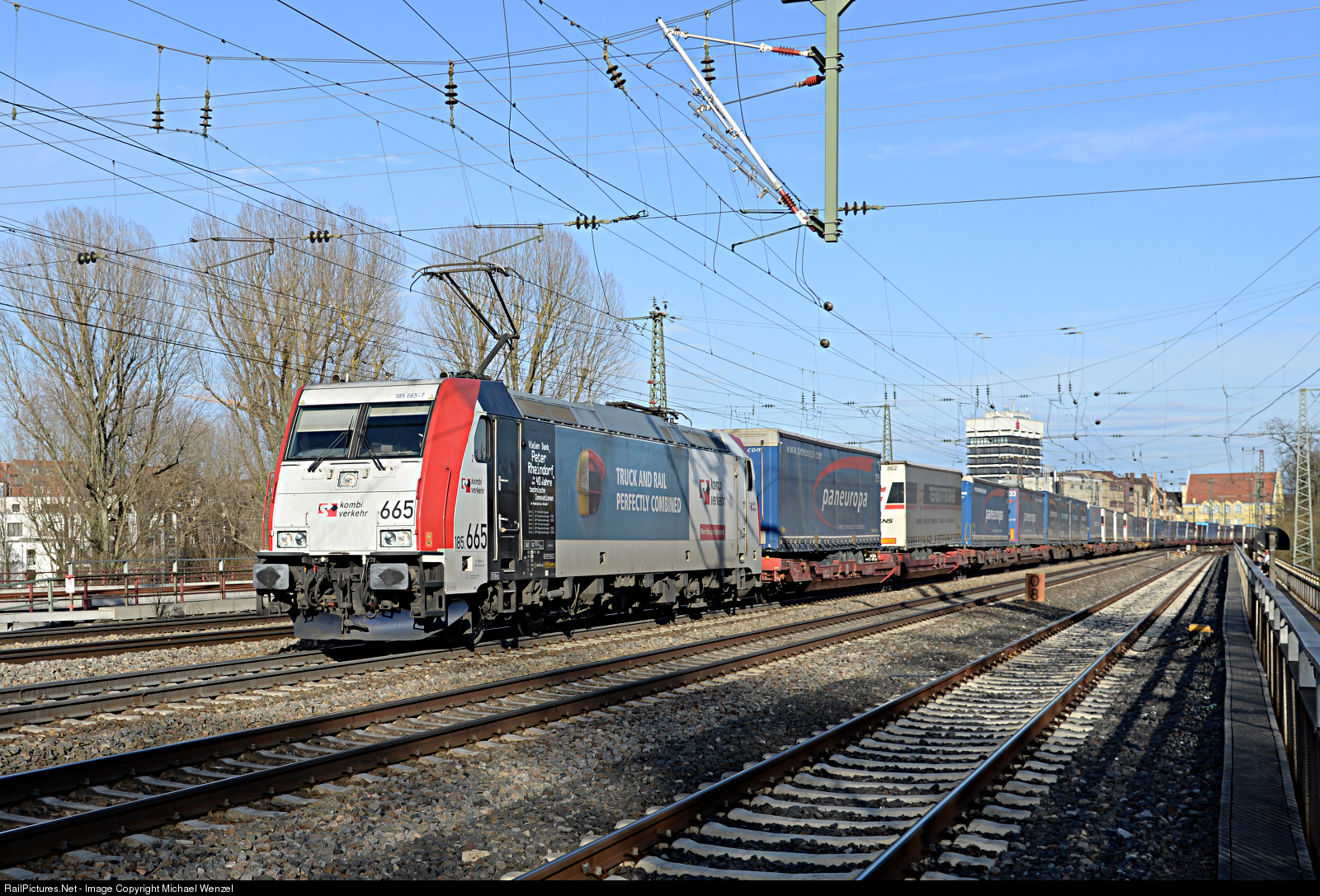 | 185 665 has just passed the Bridge called "Siebenbogenbrücke", a few hundred meters northwest of the mainstion of Fürth with a northbound combined Cargo Train in Direction Würzburg. Lthe Locomotive has an Advertising paint-sheme for cominde Cargo. |