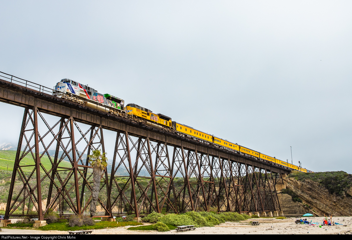 Union Pacific No. 1943, The Spirit, honoring our Armed Forces fly’s across the Gaviota Trestle with 20 Armour Yellow cars in tow. The Special will overnight in San Luis Obispo and continue on to Oakland Ca. tomorrow.