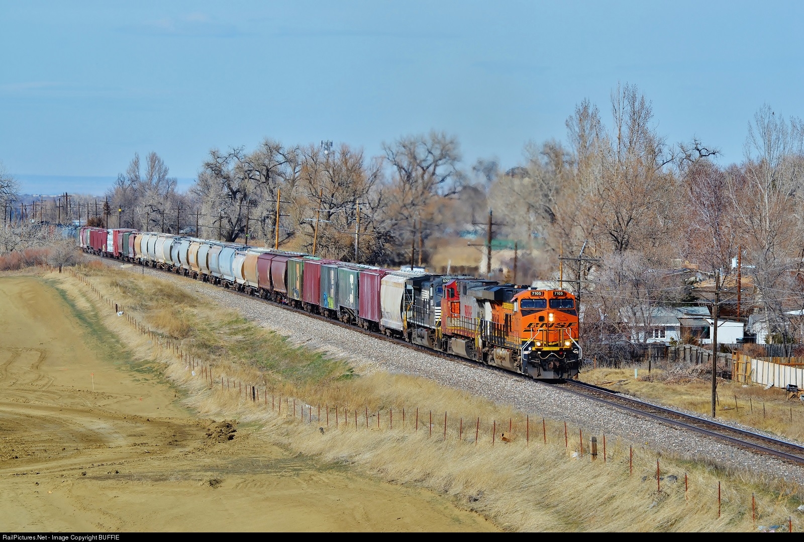 | BNSF 7105 (ES44C4) leads a Norfolk Southern and a Warbonnet lashup as it leaves Loveland and heads toward Longmont, Colorado |