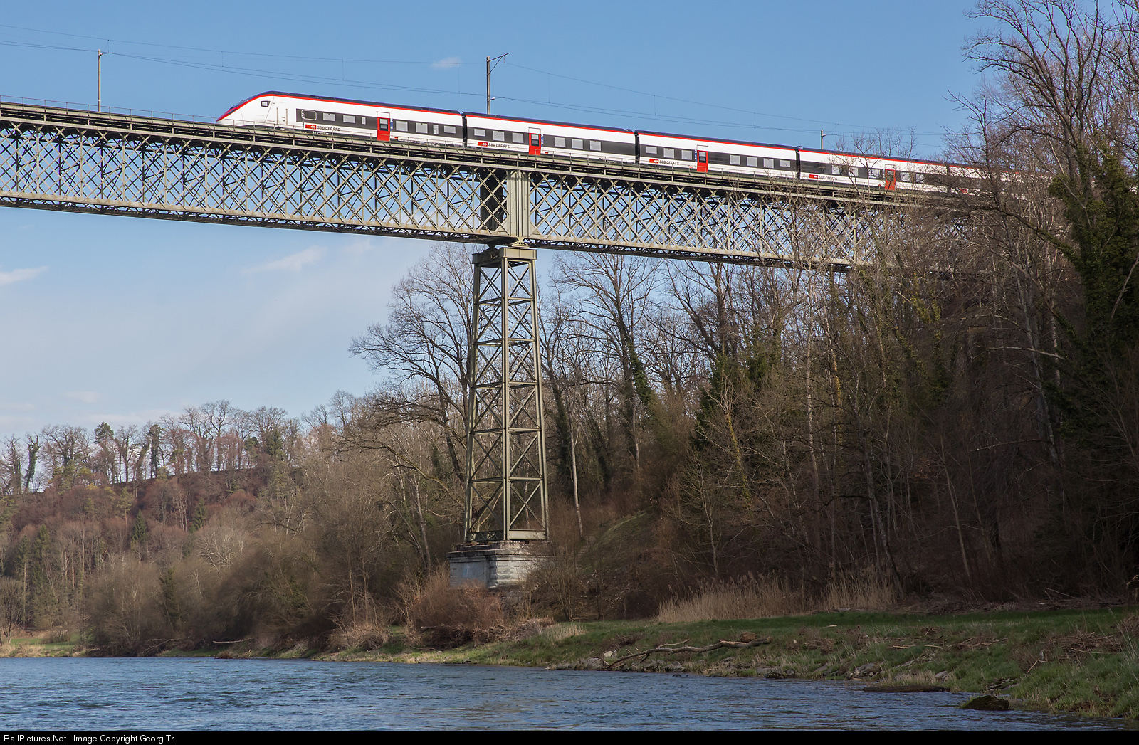 The newest train of the SBB, "Giruno" RABe 501 # 005, is crossing a viaduct from 1875. The 332 meter long and 42 meter high viaduct over the Thur river between Ossingen and Thalheim-Altikon with a main span of 72 meter was inaugurated in 1875 as part of the railway line from Winterthur to Etzwilen. The "Giruno" is on a test drive for torsional vibration testing. This single track line has only few traffic (one regional train per hour and direction) and many curves of medium radius, the track speed is between 80 and 95 km/h. Another train of this series, # 004, set a new speed record for a swiss train in Switzerland, with 275 km/h (170,8 miles per hour) in the Gotthard Base Tunnel some days ago. The nominal maximum speed of the Giruno is 250 km/h.