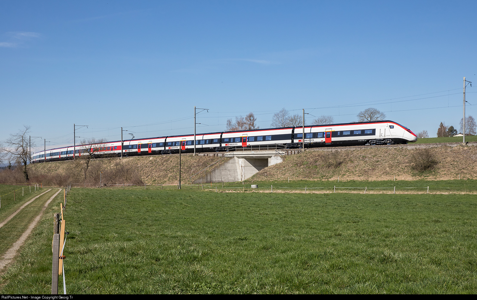 | Test run of the new highspeed train "Giruno" (SBB designation) or SMILE (StadlerRail designation, meaning "Schneller Mehrsystemfähiger Innovativer Leichter Expresszug" or "fast innovative light express train for several electric systems"), RABe 501 # 005 near Ossingen. The single track line Seuzach-Etzwilen is well suited for such test runs, which many curves of medium radius and not much traffic (one regional train per hour and direction). |