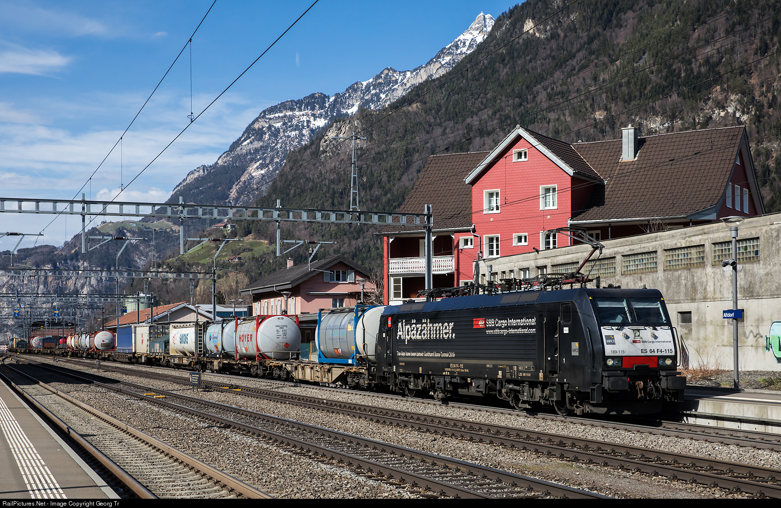 | Southbound intermodal train 40245 from Antwerpen Goderen/Belgium to Gallarate/Italy (Busto Arsizio intermodal terminal) with Siemens ES 64 F4 # 115 of MRCE, leased to SBB Cargo International with "Alpäzähmer" (teamer of the alps) inscription. In the background the mountain with a cross on the top is Rophaien above Flüelen, 2077 meter high. |