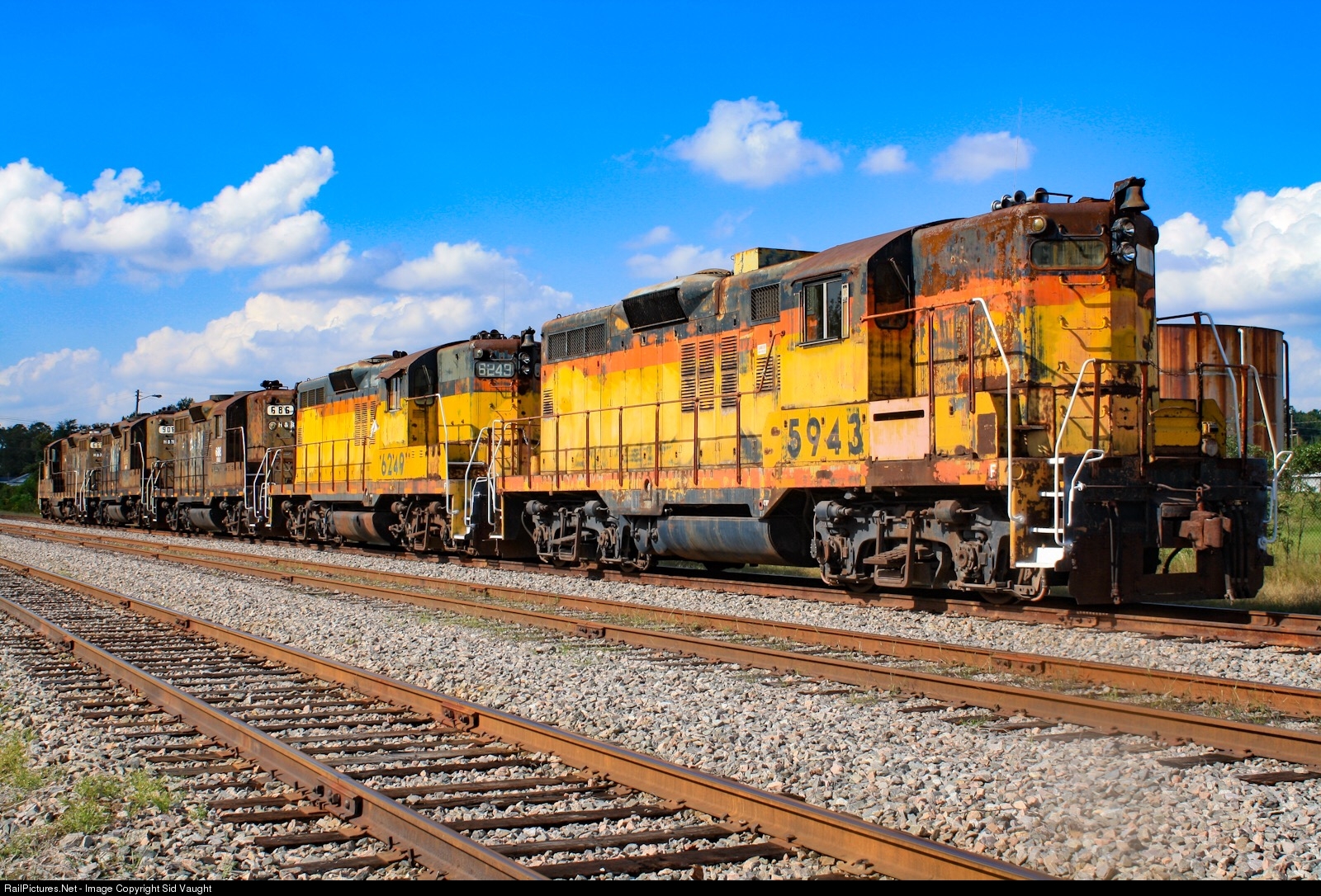 | All lined up with nowhere to go. Despite their looks these ex-N&W and C&O units were well maintained, as was the railroad until SCE&G pulled the plug on its Canadys coal-fired plant. Now the units are gone and the track is owned by a local industriall development agency. |
