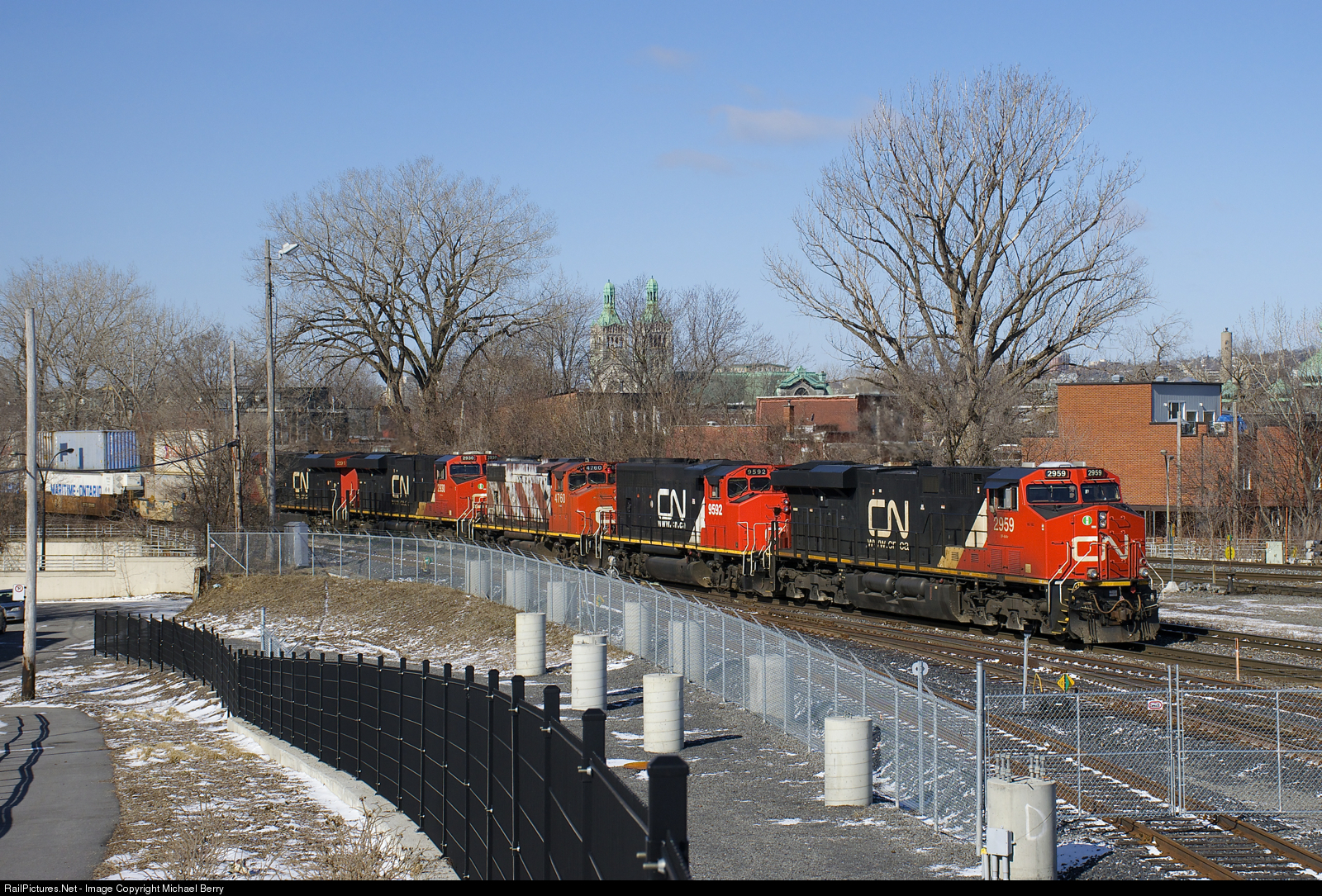 | Geeps trailing. CN 120 has two geeps trailing (CN 9592 & CN 4760), along with the usual complement of GE power (CN 2959 leading, CN 2930 and CN 2911 fourth and fifth and CN 2965 mid-train). It is passing the railfans park beside the Pointe St-Charles Yard. |