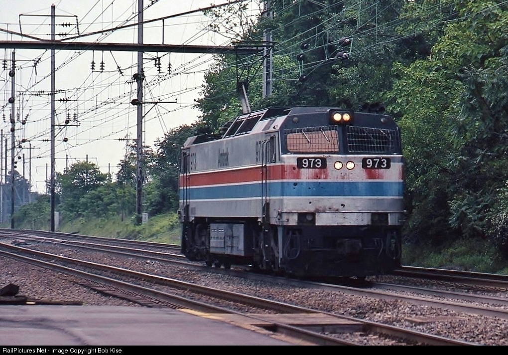| Northbound quad-headlight equipped No. 973 is running light and running fast, perhaps on its way to the Wilmington Shops. The 973 was built by GE in January, 1976 and was definitely in need of a makeover at the time of this photo. |