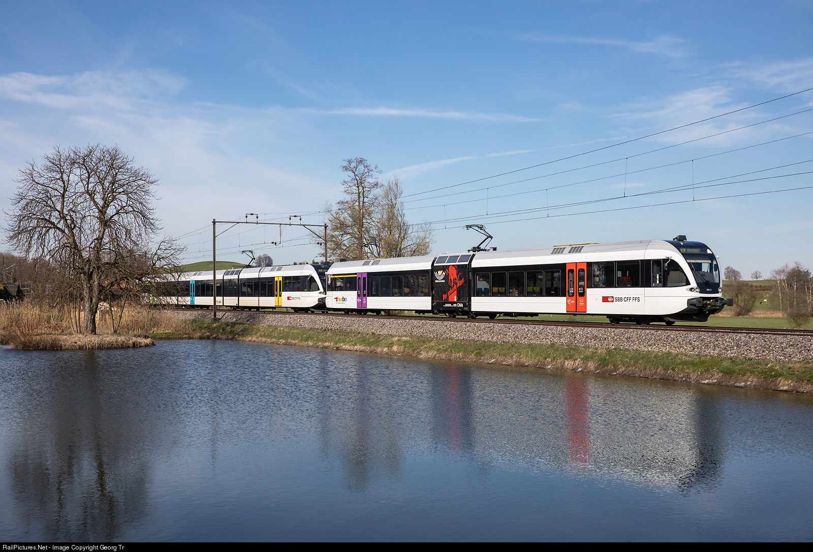 | Articulated lowfloor regional trains "GTW" RABe 526 # 704 (with "Der scharfe Maxx" paint scheme on the power unit) and # 772 of SBB daughter Thurbo are running the S 7 service # 23737 from Weinfelden via Romanshorn to Rorschach, passing the pond at Riedt near Erlen. |