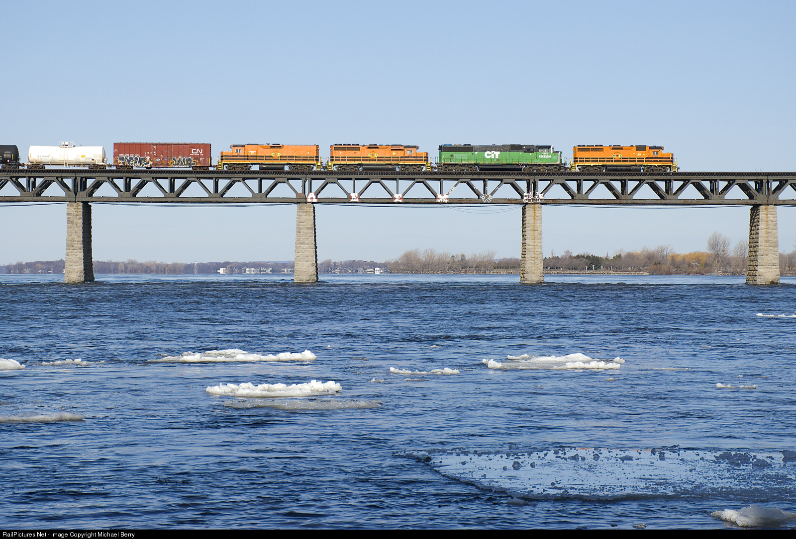 | The second to last inbound detour to enter Montreal is crossing the St. Lawrence River. Power is QGRY 3105, CBFX 6028, SLR 3803 & SLR 803. |