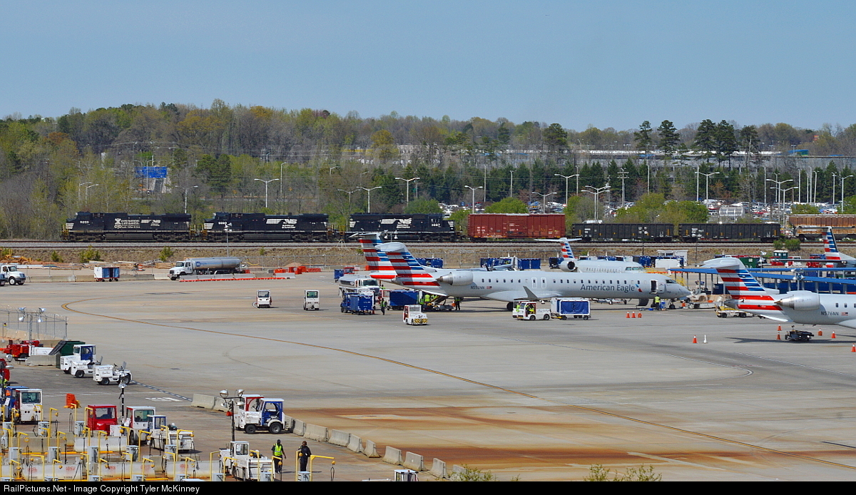 Operation Life Saver Dash 9 9255 leads a manifest train past the busy regional hub at Charlotte Douglas International Airport.