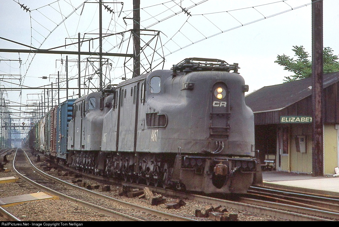 A pair of Conrail GG1s hum through the station at Elizabeth, NJ, on the point of a southbound freight. Two years later, Conrail would end electric freight operations and these veteran motors would be retired.