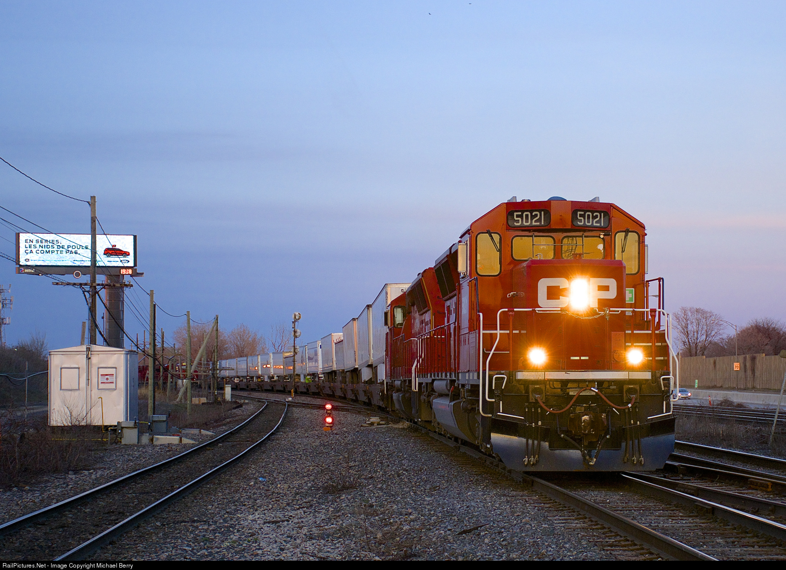 Sun setting on the Expressway. The sun is setting as CP 133 approaches Lachine Station with a pair of SD30C-ECO's for power (CP 5021 & CP 5005) in April of 2017. The sun is also setting on this train, as CP 132 & 133, the last exclusively piggyback trains in Canada, will cease running on June 1, 2018.