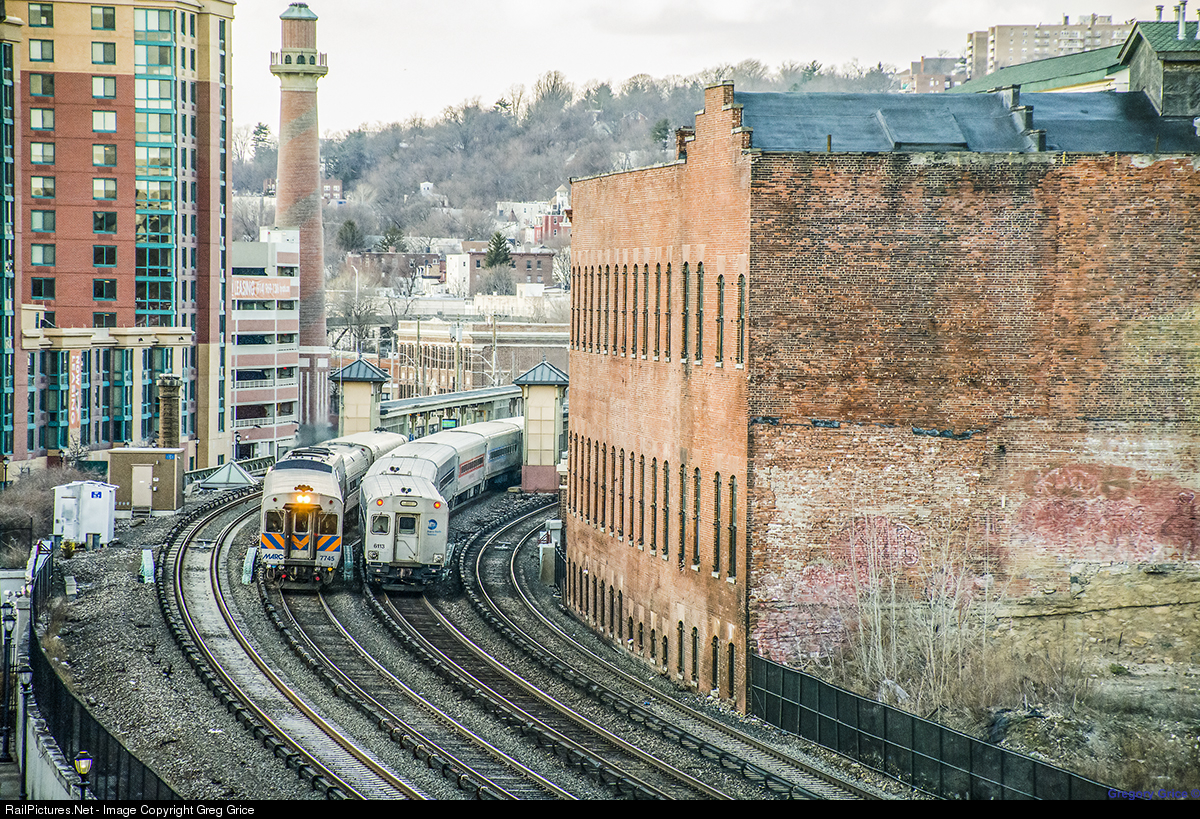 Nippon Sharyo MARC II Cab Car 7745 leads the Amtrak Training train south past the city of Yonkers on Metro North's Hudson Line. The train is making several trips up and down the Hudson to prepare Amtrak Empire Corridor crews for the summer detour into Grand Central Terminal.