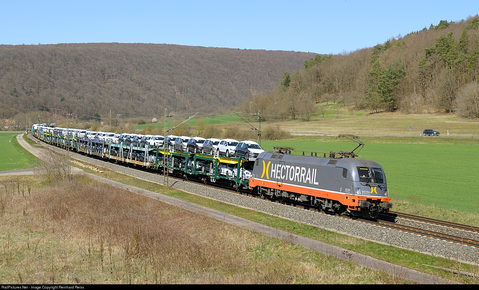 Hectorrail 242.504 heads a southbound auto train near Wernfeld