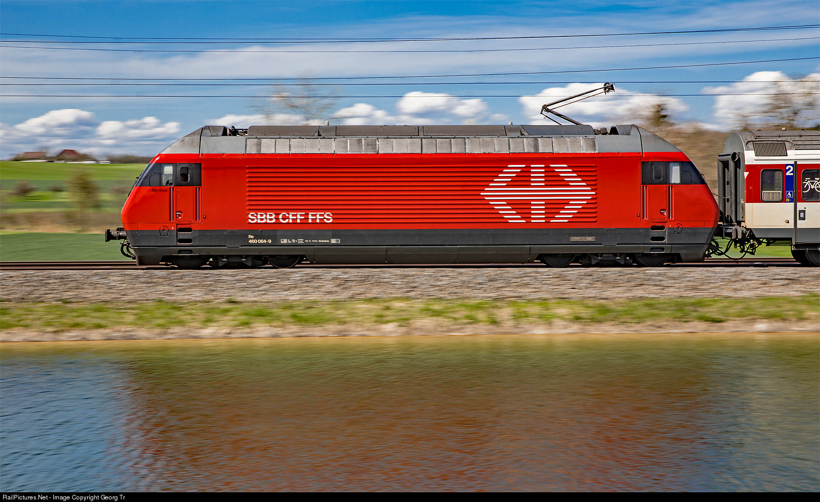 | "Pininfarina" designed Re 460 # 064 "Mythen" is pulling IC 824 from Romanshorn to Brig along the pond at Riedt near Erlen with 125 km/h. A hand held pan shot with 1/100 second. |