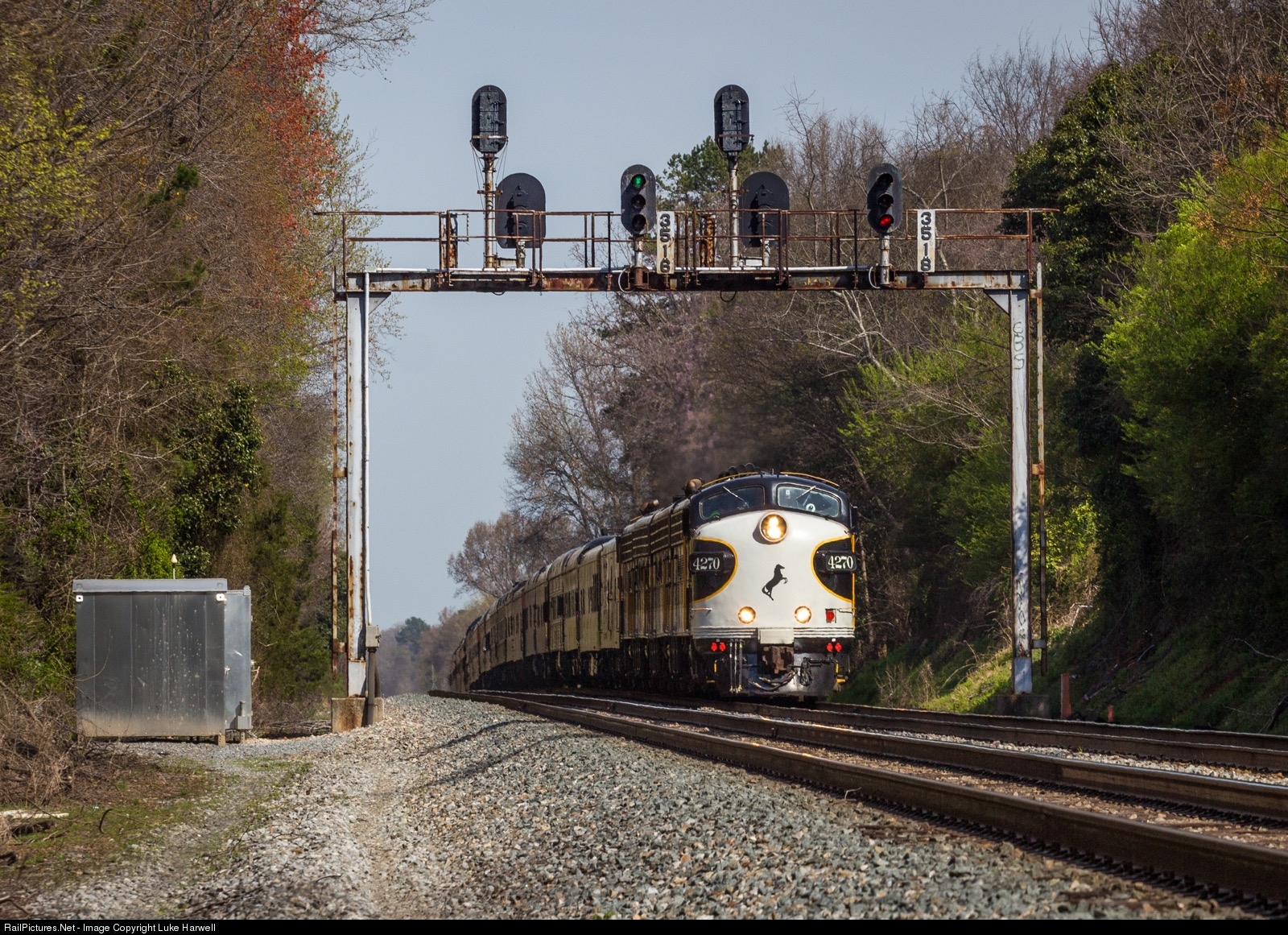 The full NS A-B-B-A set pulls the deadhead OCS south towards Augusta GA under the aging Southern Boxcar Frame signal bridge.