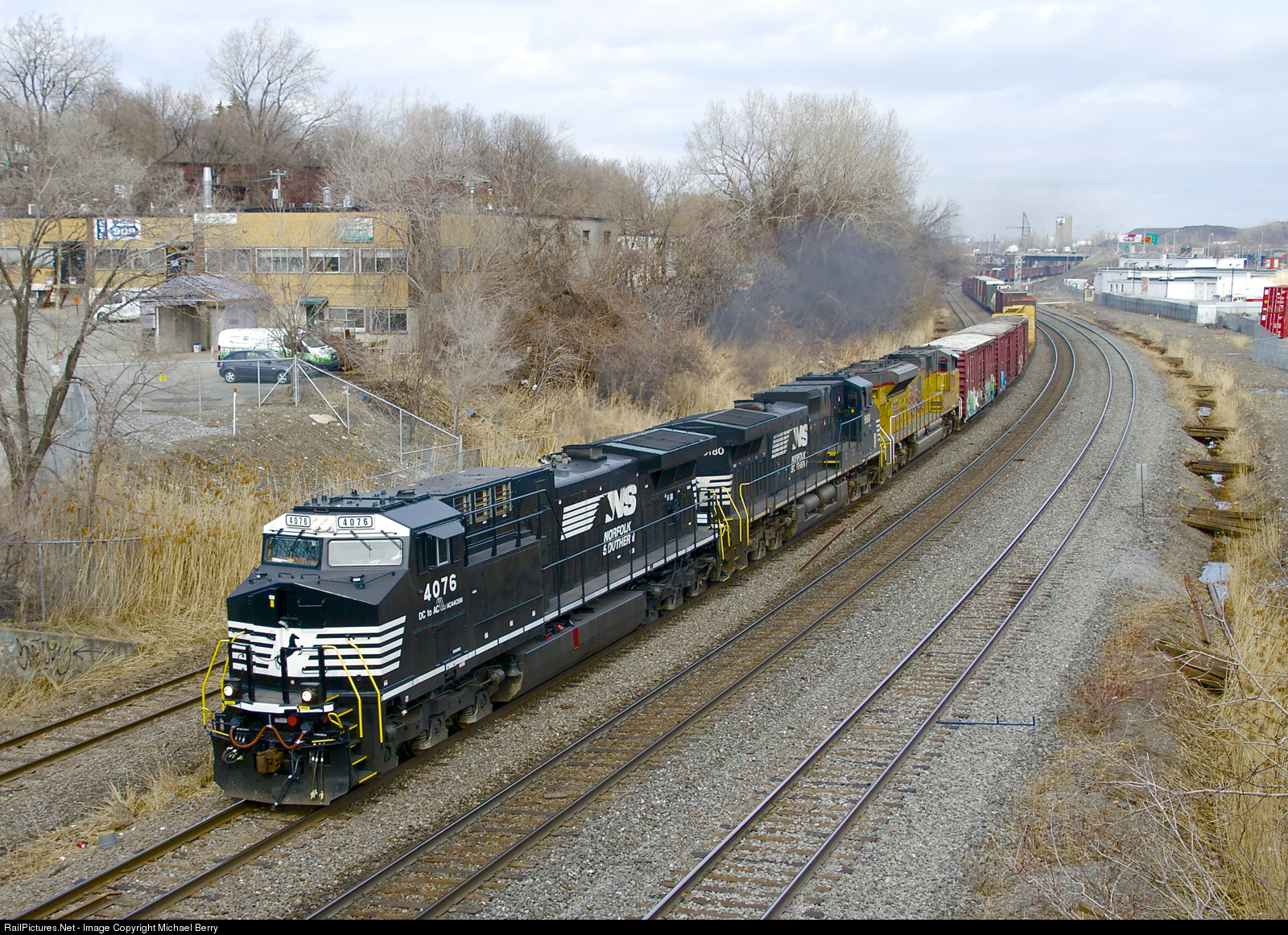 | Rebuild leading. Released from the Juniata shops just two months ago (after being rebuilt into an AC44C6M from C40-9 NS 8886), NS 4076 is the leader on a 48-car CN 529. Trailing is NS 9180 & UP 8935. |