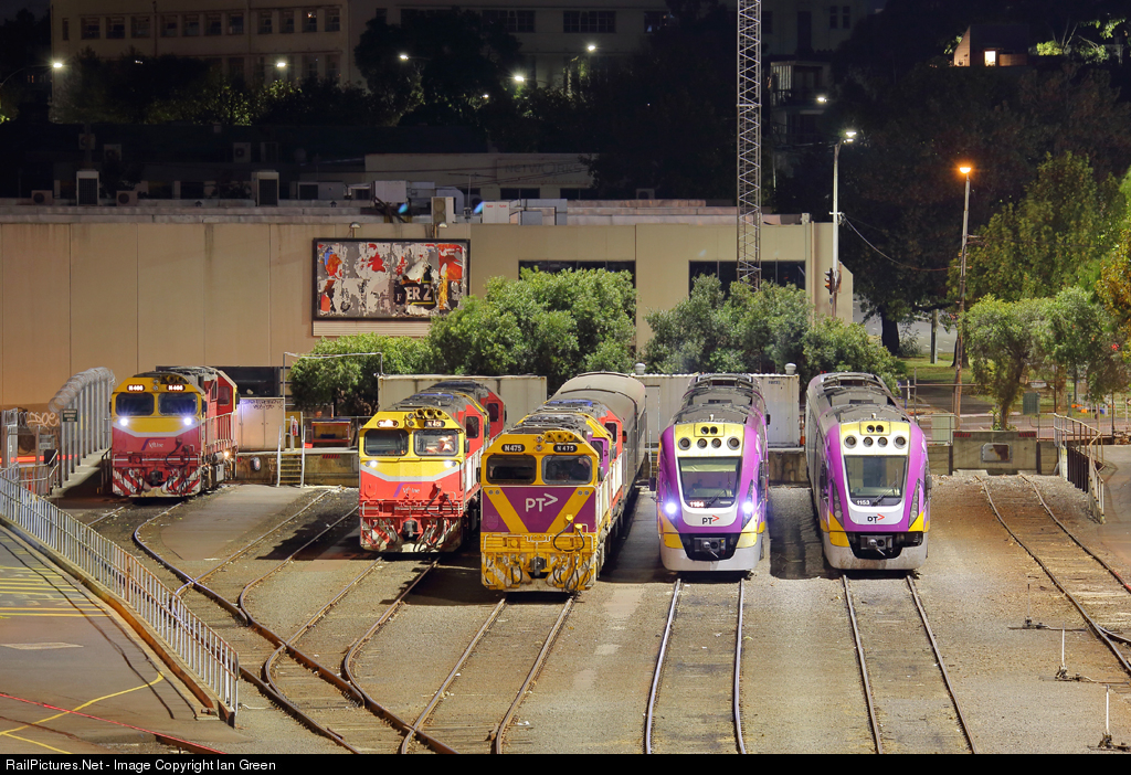 N class loco's and Vlocity railcars rest in the passenger yard near Southern Cross Station.
