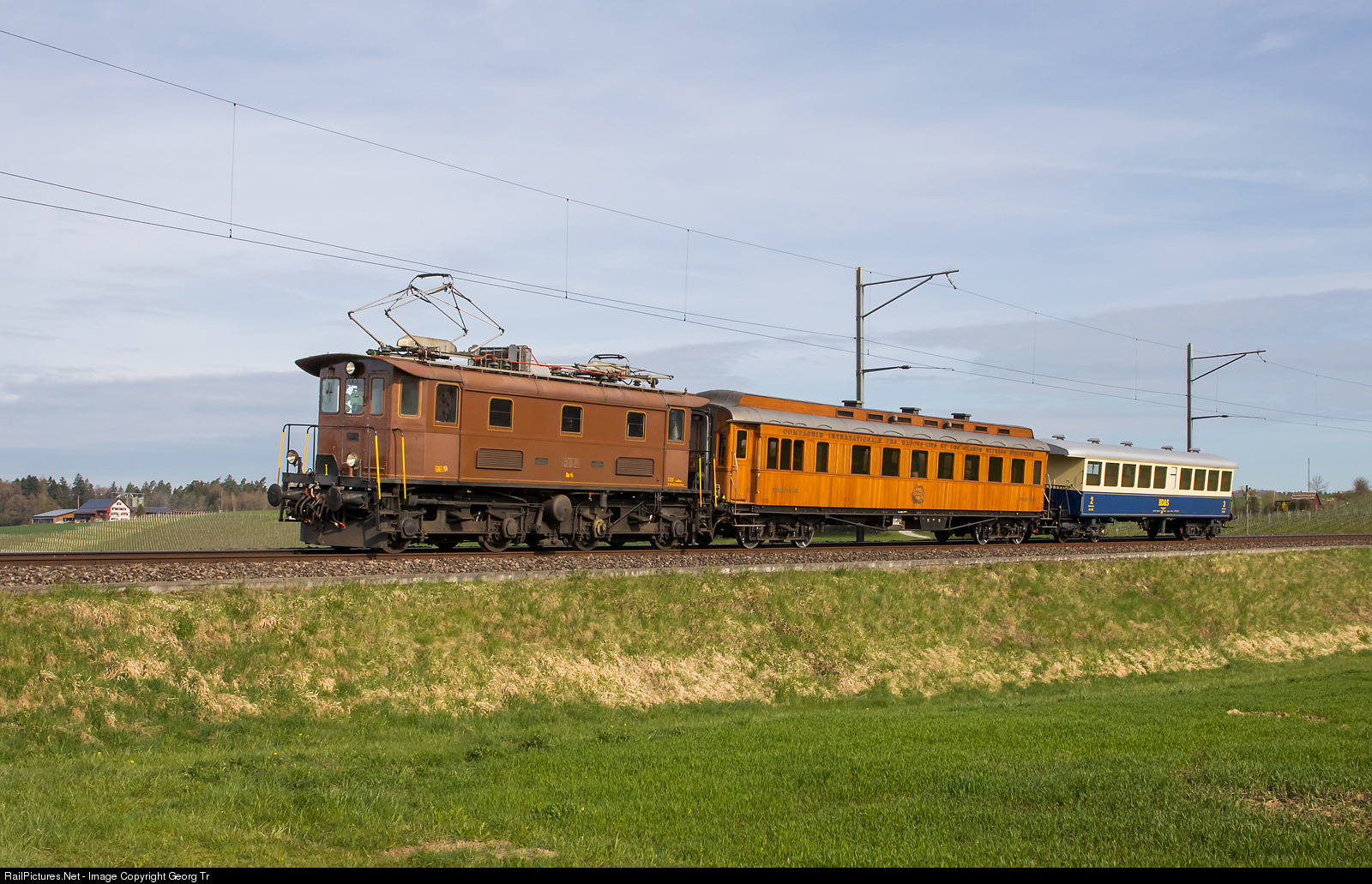 Former Bodensee-Toggenburg Bahn (BT) locomotive Be 4/4 # 14 (SLM and SAAS 1931) of Eurovapor Sulgen is pulling a birthday party train from Etzwilen to Oberwinterthur near Ossingen. The cars are privately owned former Oswald Steam/Südostbahn "Teak-Bar" car and blue/cream BC # 521.