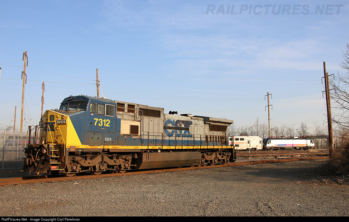 | A former CSX, nee Conrail, CW40-8 is parked on the west end of the Linden Branch. A NJ Transit train whizzes by the battered locomotive. |
