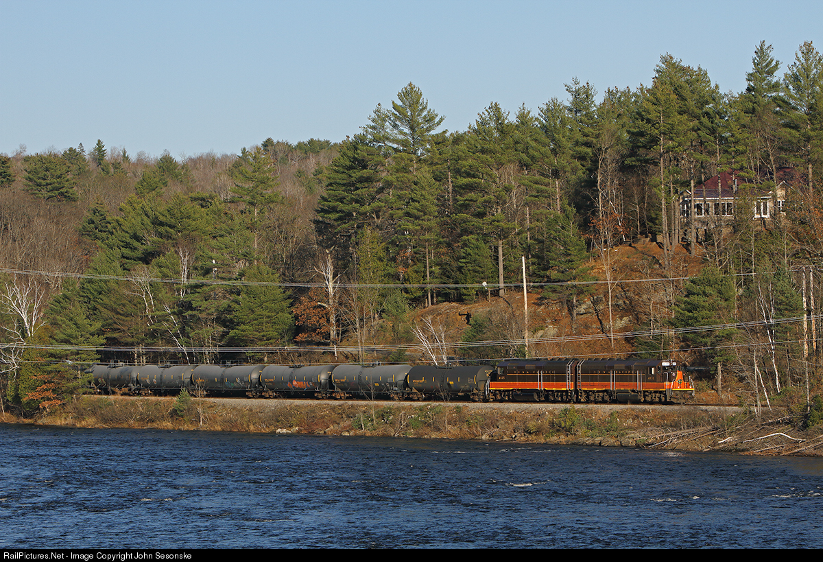 | The Saratoga and North Creek Railway is seen moving a set of storage tank cars NB along the Hudson River in the Fall of 2017. The train is approaching North Creek. This was the third of 3 moves to place empty, cleaned tank cars into storage on the Sanford Lake Branch north of North Creek. Train consisted of 12 tank cars, 2 boxcars and the IP full dome Summit View, SLRG 554 on the rear. This is the former D&H Adirondack Branch. |
