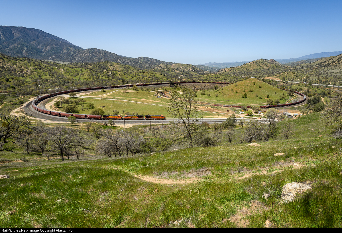 | On a warm April morning, BNSF 7167 leads a southbound empty grain train through the famous Tehachapi Loop, an engineering marvel built to help trains climb the grade at an easier pace. |